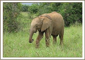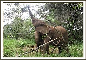 After the mudbath, on a hot day, Kenze was allowed out of his Stockade to join the other orphans. He looked nervous, and when he got out in the bush, he remembered his wild life, and became very aggressive to the Keepers, charging them whenever they approached. He spent the afternoon as far from the Keepers as possible. We had quite a job to get him back into his Stockade for the night.