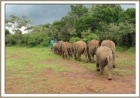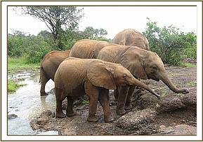 A group of impalas came running towards the older group of orphans today, which prompted a general retreat back to the Keepers. Only Sian, who is the Nursery Matriarch, stood her ground, and flapped her ears at the impalas, which made them disperse in a different direction. The orphans were very playful during the mudbath today. Since heavy rains, water is seeping from the ground near the mudbath, forming a beautiful, deep, natural mudbath which the orphans thoroughly enjoyed. In the late evening, the Chyulu De-Snaring Team Leader alerted us to the possibility of an elephant rescue, having been told by members of the neighbouring community that a young elephant had been spotted near a village called Kenze.