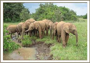 Lempaute is always very close to Lesanju. During the mudbath Lesanju moved away out of sight, which disturbed little Lempaute. She ran along the line of visitors screaming, which attracted Galdessa and Shimba, who were busy playing. They came running to her and all three settled down once they had found Lesanju, who was behind a bush.