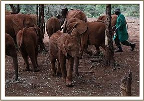 Ambo decided to spend time with the older boys Kauro, Ndotto, Sapalan and Lasayen today. When Mbegu saw that Ambo was okay in the company of the older boys, she went over to the keepers where the young babies were and took Sattao with her. Tagwa saw them walking away and ran over to accompany them, and the three of them walked out into the forest. They stayed out there together until it was milk feeding time. When the three walked back to the rest of the group for milk, Sattao was running ahead very excited and playful with Mbegu and Tagwa just walking behind. He was so excited he tripped over a tree root! Jotto and Malima heard Sattao and came running towards him trumpeting, and all three ran towards the milk feeding area. All three were very happy with their game and were trumpeting with excitement.