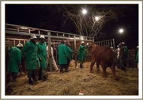 It was 2.30am when the process began of loading Kauro, Sapalan and Namalok to begin their journey to Ithumba. Kauro is very familiar with the lorry as he has already been in it twice – down to Ithumba and back again when he became unwell. Namalok and Sapalan were already used to the lorry as well, having undergone their training and familiarization. Each orphan came out of their room with a keeper enticing them towards the lorry with a milk bottle; although of course for Namalok it was a bucket of milk as he never accepted the bottle! It was an easy walk and entrance into the lorry for Sapalan and Namalok and their gates were shut immediately. Kauro took a little more convincing as he got half way into his pen when he stopped and stretched his trunk forward to smell around. He drank both his bottles at the entrance and the keepers had to go inside and call him in. He heard their voices and walked the rest of the way onto the lorry and then his gate was closed too. Just after 3am the lorry was on the way.