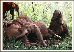 Turkwel and Kalama remain at odds with one another. Today, their dislike of one another disrupted the midday feed at mudbath time, so the Keepers had to remove the rest of the orphans from the two warring parties and feed them apart from Turkwel and Kalama.