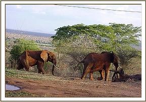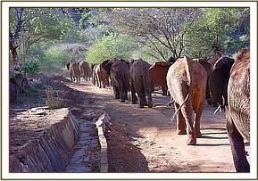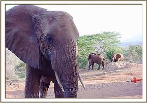 It was a hot day, and after a drink at the Stockade waterhole, the orphans headed out in a compact group, grabbing what they could as they went. Later they headed for the mudbath where they had fun, running in and out of the water, and chasing off a visiting warthog. When it was time to begin returning in the evening, Laikipia began pushing the others with his forehead to get them going, returning to do the same to Morani, who had lagged behind. Laikipia always keeps time!