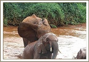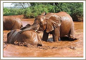The orphans woke up in a jovial mood, and indulged in the usual games around the Stockade. Icholta and Mweya found a scratching post on a tree trunk within the compound, until Nyiro forced himself between the two, interrupting this activity. Following this they all headed out to the feeding area, where the orphans had a wonderful day, bathing, and taking mudbaths in between bouts of feeding.
