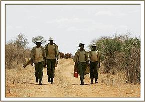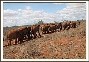It was a cool morning when the orphans left their Night Stockades, Mweiga keeping pace with the others at the rear of the column.   En route to the feeding area, they had a lot of fun chasing two dikdiks, and Mweiga joined in, throwing her foreleg forward and emitting a shrill trumpet.   After this they all settled down to feed.