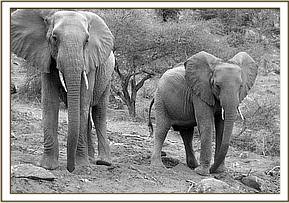 It was another cool morning when the orphans left the Stockade.   Laikipia and Solango enjoyed a test of strength, whilst Icholta scratched her trunk against a rock.   Edie and Irima led the group rapidly out to the feeding grounds, and all the orphans wasted no time in getting as much food as they could.   At the mudbath, Solango and Burra enjoyed chasing off some impala.   Feeding resumed shortly afterwards, because it was too cool to wallow, and in the evening Laikipia led the group back home, denying Burra and Solango this privilege.   In the evening Emily came alone to the Stockade to greet the orphans and take a drink of water.   She left at 7.20 p.m.