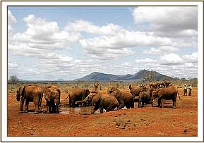 Because it was a hot day, all the orphans enjoyed plunging into the mudbath at noon.   Burra and Morani entertained the others by sitting on the bank opposite each other.   They took a long mudbath today, because it was so hot, and in the evening were happy to return home, led by Laikipia.