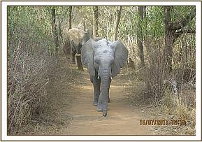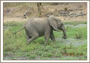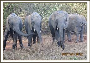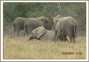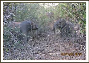 In the morning when all the babies had got up and ready for the day, the boys Ngasha, Ziwa and Jasiri walked out with Quanza to the bushes alongside the springs area. Quanza soon turned back as she came across some army ants on the path and was concerned about them going up her trunk and giving her a bite.