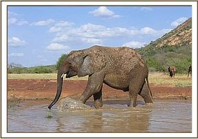 At the Stockade in the morning, Taita and Tomboi spent time chasing and pushing one another until Yatta decided it was time to leave. Shortly after 8 a.m. the sudden appearance of two warthogs chasing one another startled the babies, who wailed and trumpeted as they ran to their Keepers for protection. The Keepers calmed them down but Buchuma, Sunyei, Madiba, Wendi, Tomboi, Naserian, Ndomot and Galana remained nervous and chose to feed close to the Keepers. The weather turned hot by noon, so the orphans enjoyed a prolonged mudbath.