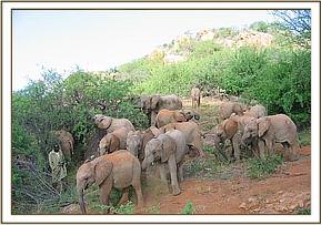 Two sprinting lesser kudus scared Buchuma, Naserian and Rapsu who took to their heels. Nasalot, who was some distance away, ran to comfort them. Later a bunch of hungry baboons passed nearby chasing a dikdik, but Yatta, Nasalot, Kinna and Napasha, chased off the baboons and disrupted the hunt, saving the dikdik. At first the baboons stood their ground, but when they spotted the Keepers, ran off, much to the joy of all the elephants. Rapsu and Madiba made a pretence of chasing after the dikdik.