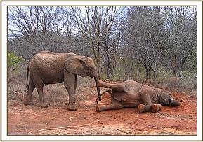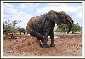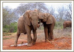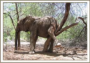 Having left the Stockade in the morning, Sunyei, Tomboi and Rapsu enjoyed a charging game, then knelt down to dig up soil with their stubby tusks whilst the older orphans scratched off ticks against nearby rocks and trees. Later Yatta dug up red soil so that Olmalo and she could dust themselves. Because it was cool, at mudbath time, the orphans took a soil bath instead.