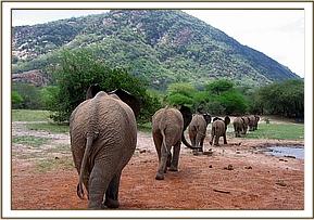 It was a cool morning. Rapsu, Naserian, Buchuma, Nasalot, Yatta and Olmalo enjoyed rolling against the banks of a small stream. None of the elephants wallowed today, so Yatta led them to the slopes of Ithumba hill to feed for the rest of the afternoon.