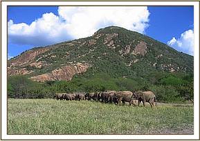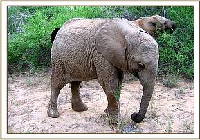 It promised to be another hot day as the orphans left in the morning. Shortly before mudbath time, Tomboi, who was feeding close to Naserian, tried to mount her. This angered Nasalot, who strode forward to discipline Tomboi, but he saw her coming, and fled before she could catch up with him.