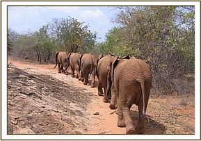 Just before dawn, a herd of wild elephants again paid a visit to the Stockade, and drank from the water trough. They spent some time “talking” to the Stockade inmates. When the orphans emerged at dawn, Yatta took the group following the tracks of the wild herd until they reached the Kanziko road, where they lost the tracks. They searched until 9 a.m. and then gave up, concentrating instead on browsing. At l0 a.m. two lesser kudus ran past the youngsters, scaring them and making them bellow for help.