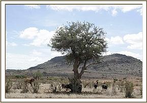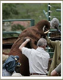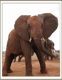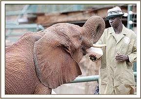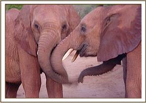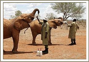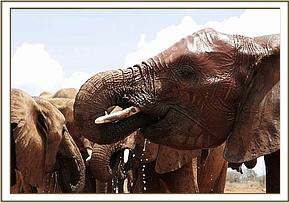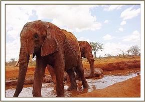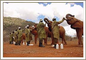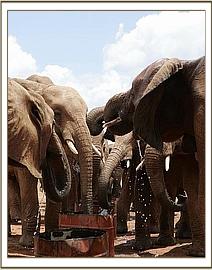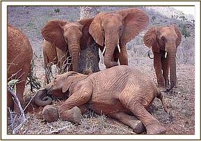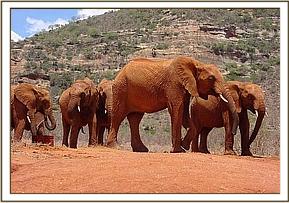 It was a cloudy morning, so the orphans came out active, chasing each other around the Stockades. During the morning they fed calmly down on the plains, and only took water at the mudbath, joking by trying to splash each other with a spray from the trunk. Having fed during the afternoon, they hurried back to the Stockades for their supplements.