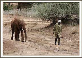 The orphans again fed on the N. face of Mazinga Hill, and only took a brief mudbath. Laikipia, who is very greedy over the Copra cake, led the orphans back in the evening very fast, and noticing that Mweiga was way behind, Burra returned to fetch her.