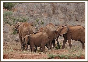 Having had their early morning milk in the morning, Seraa, Mpala and Burra rushed to Mazinga Hill to get ahead of all the others and avoid competition for any tasty greens, but Ilingwezi caught up and overtook them. Meanwhile Sosian and Mweya went to take Mweiga to follow the others at her own pace. At the noon milk feed Natumi stood beside Mweiga while she had had her milk and then went slowly with her to join the others at the mudbath.