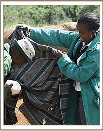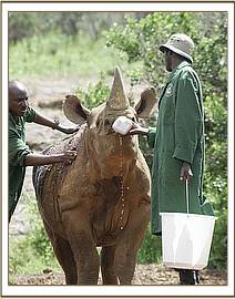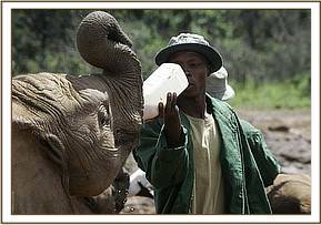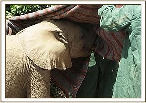 After several days of trying to get Orok used to the blanket by holding it whilst he takes his milk, this ruse failed, and he continues to flatly refuse to have it over him.   Because the cold weather is coming, this has worried Mrs. Sheldrick, so it is planned that he accompany Sidai and Challa to the Ithumba Reintegration Centre in June, where the weather is a lot warmer.