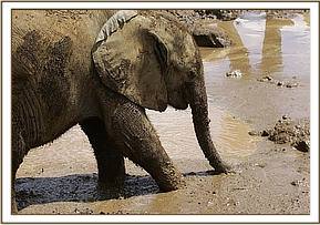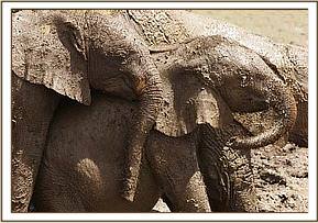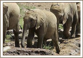 A herd of impala startled Loijuk whilst she was feeding in the bush.   Sian and Lualeni rushed to determine what was wrong, accompanied by Makena.   At the mudbath Kora found himself bogged, so Sidai came to the rescue, helping him up by using her foreleg and trunk.