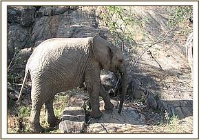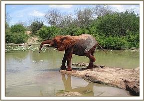 Sunyei and Naserian led the way out to browse today, Lualeni, Rapsu and Sidai already having started feeding around the Stockades, while Kenze and Kora opted for a scratch instead. At around l0 a.m. it was very hot, forcing the orphans under shade until the Keepers called them for the mudbath, where they all enjoyed a cool-off. Kora and Ol Malo did not stay in the water long, but the others remained in the waterhole for at least another 30 minutes before joining Kora and Ol Malo, both of whom are not fond of getting wet! Once again the afternoon feeding session was at the Kalovoto area where the vegetation is still green.