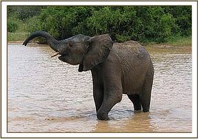 Wendi and Kora opened the day’s activities with a pushing match until Yatta led the entire herd northwards, heading to the Imenti waterhole at noon, only to miss a wild herd who had been drinking there shortly before their arrival. The orphans thoroughly enjoyed bathing in the waterhole, Lualeni mounting onto Challa and Kora as they were lying in the water, and the others playing many games until Yatta called off the exercise. She led the orphans in the direction taken by the wild elephants. In the evening Sian and Kora led the first group back to the stockades whilst Yatta remained at the rear guarding little Orok.