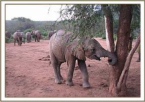 The orphans headed out to feed in an up-beat mood, deliberately bumping into each other playfully as they went. In the bush Galana, Kamboyo, Sunyei and Sidai enjoyed a soil bath against an anthill while Kora and Challa engaged one another in a strength test, which lasted quite some time until Nasalot decided that “enough was enough” and separated them. Since it was a cool day very few orphans went into the mudbath, most of them opting for a soil bath instead.