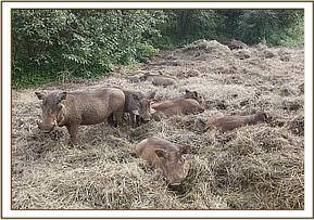 The wild pigs enjoying the elephant hay