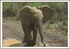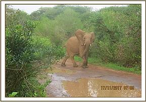 By the time the orphans returned to the stockades the previous night they found a bush buck taking refuge from the heavy rains in one of the empty stockades. Alamaya was the first to smell the bushbuck and signaled to Lima Lima and it was not long before they orphans started charging around trumpeting loudly in an effort to get the bushbuck to leave. Murera and Sonje tried to get into the stockade but were unable to as the door was closed. The keepers decided to leave the bushbuck where he was and he left of his own accord, aided by some coaxing from the keepers, once the rains stopped.