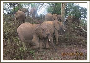With the rain the mud on the orphan’s bodies was washed off, turning them grey and making it difficult for the keepers to spot them when they were in the bushes. Later in the morning Lima Lima sneaked back to the stockades looking for pods to snack on as a treat. She found the gate closed as the keepers were cleaning the stockade and did not want her coming in and making a nuisance of herself preventing them from finishing their task. When she realized that they would not let her in she turned and went back to the rest of the orphans together with Faraja and Ziwa who had followed her to see what she was up to.