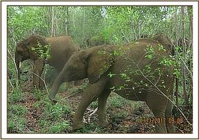 The orphans had a lovely day browsing in the forest and looked very relaxed as it approached the time that they would be returning to the stockades. As they waited it started to rain and some of the orphans sought refuge under the trees while the keepers opened their umbrellas. Lima Lima decided that she wanted to be with the keepers and tried to squeeze in among them so that she was standing under the umbrellas with them and share their cover, something that ended up looking quite funny as she really did not fit.