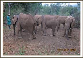 All the elephants returned home this evening after a long day out in the forest browsing. Some of the handicapped babies looked particularly tired and as if they needed some help from the keepers. Murera kept looking behind to make sure that Mwashoti was not falling too far behind while Alamaya rumbled encouragement to Mwashoti letting him know that they didn’t have long to go before they would get to their bottles.