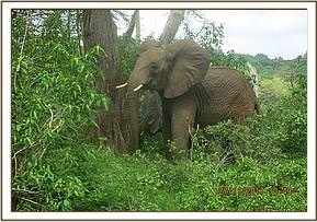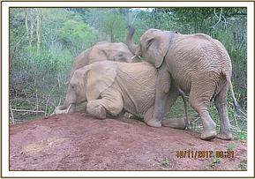 Once in the forest Murera and Sonje rumbled to the two youngsters who were heading towards the older boys, running crazily through the bushes, to get them to stay by their side. None of the boys seemed to want to listen to the keepers or the matriarchs who were trying to get them in line when it started to rain. The keepers thought it best to seek refuge under the trees and wait for the rain to finish but the orphans had different ideas and continued on the path to the forest. The keepers followed them and by the time they got to the browsing ground both the keepers and orphans were quite wet and the keepers watched as the elephants played on some mounds that they found in the forest.