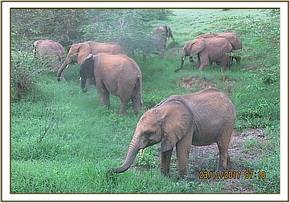 It looked as if the Chyulu Hills had also received quite a bit of rain and the orphans made their way there to browse until it was time for the midday milk feed. As it was quite wet none of the orphans wallowed in the water choosing instead to have a quick dustbath before resuming with their browsing activities.