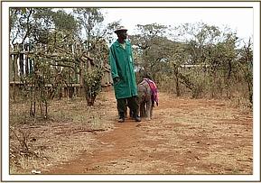 Later in the morning just after 10am a call came from the Save the Elephants camp in Samburu that they had a lone baby elephant. A rescue team was assembled immediately and within a few minutes they left for Wilson airport. By noon they had left for Buffalo Springs airstrip and within one hour they had landed in Samburu. On arrival they found a very tiny baby waiting for his flight to Nairobi. The baby had been found all alone by Samburu herders that morning. He was given some milk which he took well, which also confirmed he had been without his mother’s milk for some time and at least over 12 hours. The calf was a few days old and no one knew why he has been left behind. His condition was not too bad and he just seemed a bit confused. The little boy was flown to Wilson and by 3pm he had arrived at the nursery. He was off loaded and put straight into his pen next to Lasayen. After resting for a little while he took some more milk and went out for some exercise to stretch his legs in the compound. He went back into his stable to wait for his new friends to arrive. When Lasayen came back at 5pm he immediately noticed the new baby in the stable next door. He tried to reach out to his through the space in the wall but the little baby was shy and was more interested in his new keeper.
