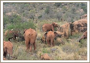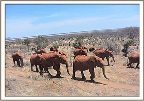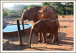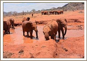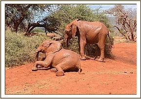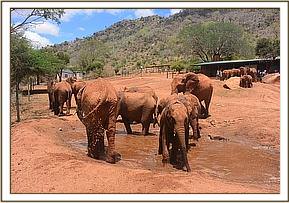 After enjoying the supplements, Kenia and Ndii were allowed by Sinya and Lempaute to lead led the orphans out to browse where the orphans spread out to browse. Ndoria lagged behind the others when they went to the water hole that afternoon, but came running after them to ensure that she got her share of milk. After the mudbath the orphans browsed peacefully until it was time to head back home in single file.