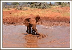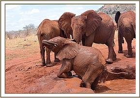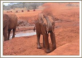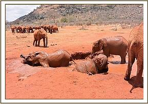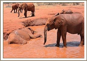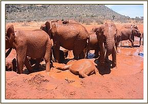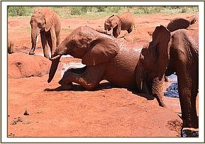 The orphans welcomed a light rain shower today. Later in the afternoon Ndii was jealous of Dabassa who was dominating the mud bathing games. She tried to expel him from the mudbath but Dabassa stayed put throughout. Later all the orphans came out of the water to browse nearby nearby for the rest of the day.