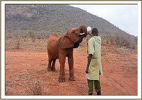 Having taken their milk, Panda’s group went to greet the new arrival “Araba” before joining their peers who were feeding on copra cake. Tundani and Nelion had a soft sort for Araba and remained with her for longer, even foregoing their supplement food that morning. Later the two joined their friends who by that time had started leaving the stockades for the bush. Araba obviously missed them but was happy again when they turned up again that evening for the night. Being still milk dependent, she needs to stay inside for longer than the Nairobi Nursery babies in order to become familiar with the Keepers and her her new family rather than be tempted to escape.