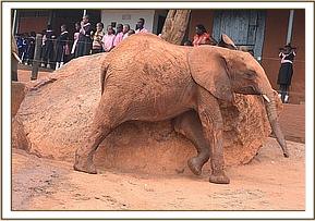 There were light rain showers in the morning as the orphans left the stockades. They all enjoyed browsing on the moist vegetation. After three hours of undisturbed feeding, Kivuko surprised Lentili when she knelt down on her front legs to eat a bush that was very low to the ground. Lentili watched Kivuko in great amazement. Lentili was tempted to use the same stance to get the fresh shoots. At noon the milk dependent orphans enjoyed their midday feed as the other orphans who have been weaned rushed to cool down in the mudbath.