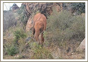 Lesanju and Lempaute led the orphans out to browse today. They enjoyed a very brief moment of scratching on the outcrop of rocks at the foot of the Msinga Hill before moving and settling down for browsing. Rombo enjoyed splashing on the edge of the water before Lempaute came in and took up the same water splashing game.