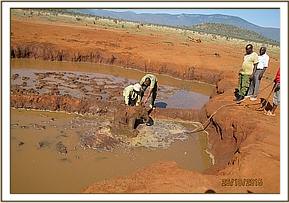 The rain shower was over after two hours or so and then the orphans turned around slowly and made their way back in the direction of the middle waterhole in for the young ones to feed again. Upon arriving there only Panda, Ishaq b, Taveta and Naipoki attempted to take that cold bath; the others decided they would rather not because of the cold water. Nevertheless the four only took a partial bath, moving out quickly to rejoin their friends.