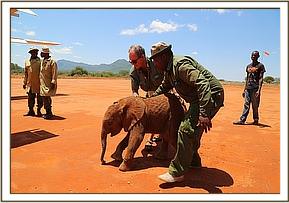 The orphans headed out to browse after taking their morning supplement. A report of a wild elephant calf stuck in mud along the Mombasa/Mzima pipeline was then received but by the time the rescue team arrived, there were no wild elephants nearby and it appeared that the calf had been there all night, its family having given up hope of retrieving it. Having extracted the male calf, he was driven to the Voi Stockades in the back of the Trust pickup. He was given water while we awaited the arrival of the Nairobi Nursery DSWT team to airlift him back to the Nursery. After the plane carrying the Nairobi team of Keepers landed at Voi, the calf was fed a bottle of formula milk and prepared for the flight back. It was not long before he settled down in the Nursery despite all the trauma he had been through, thanks to the input of “Mbegu” who was in the next door stable. H was given the name “Kwama”, the Swahili word meaning ‘to be stuck’.