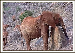 The orphans went straight off to the Northern side of the hill to feed. While going up the hill Mweiga got a good neck scratch from a rocky outcrop. She stayed there for some time really enjoying the scratch rock. Laikipia went to greet a Keeper who was close to them when feeding on the foot of Masinga hill. It was then a big scramble when Icholta and Salama also came to pass their greetings forced the Keeper to take a few steps backwards to ensure he wasn’t knocked off balance on the steep hills edge.