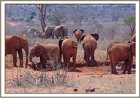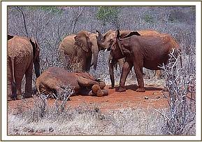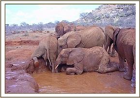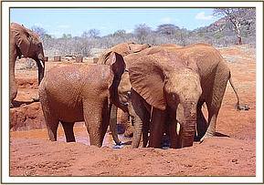 It was hot in the morning and the sun was rising fast. The orphans were scattered all over the feeding grounds, each trying to grasp something to eat as it is really becoming very dry. We went for an early mudbath today because of the heat. Natumi and Laikipia mud wallowed wonderfully interlocking their trunks as if congratulating each other as the best swimmers of the day. They all went feeding on the Northern side of Msinga hill for the rest of the day.
