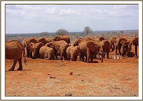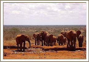 Early in the morning the orphans came out of the stockade to start their daily feeding rounds. Ilingwezi enjoyed taking the lead to feed on Masinga Hill. After some hours of feeding up the hill the orphans came down for an early bath at 10.30 am as it was growing very hot. Later a wild group joined our orphans and the waterhole. Laikipia mischievously remained in the water to welcome them, while the other orphans stood aside assessing the scene. On realizing that the wild herd were very friendly, Icholta and Natumi moved fast to join them. The orphans took a wonderful bath with them and followed them as they wondered off towards the air strip after the bath. The orphans remained behind feeding when the wild group paced fast towards the Voi river.