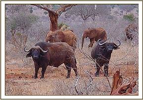 On the Northern side of Masinga Hill where the orphans were feeding in the morning, they lifted up their trunks to smell Naomi’s group which was going to drink water at 10am. They came down and followed them swiftly. Laikipia and Makwaju moved fast to secure their wild friends for a pushing match. The other orphans kept on following Naomi closely while tossing their trunks forwards to touch her. This was in a bid to woe her to leave her calf behind so that they can take it. They were not very successful as Naomi ignored them. Mpala and Laikipia freely mixed with calves in the group. Naomi stretched her trunk to welcome Burra for a bath, and Burra went forward securing a wild friend to play with. Laikipia then got very jealous over Burra’s game with his wild friend and came in to snatch him away from Burra. The orphans went with Naomi’s herd for a while , and then came back to join two wild buffalo bulls that came to drink.