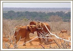 There were light showers in the morning, but nothing that could turn the parched dry land lush again, but enough to clean the vegetation and settle the dust. The orphans as a result engaged in serious feeding as everything was softened by the rain drops. There wasn’t time for play in the morning, as they just concentrated on feeding. Later in the afternoon the pushing matches between Mpala and Solango this time began. This match fast changed into a fascinating game of lying and rolling in the still damp soil. The two of them played in a completely coordinated fashion which attracted the attention of Moran, Thoma and Mweya who stood close admiring their skills. Their game came to an end when Mweya promptly stepped on them and then lay on them.