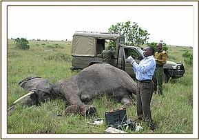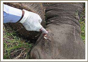 This was a case of a sub-adult male elephant which had two deep wounds on the tarsal joint of the right front leg, just above the spool. The wound was already infected with a lot of pus, fluid and necrotic tissue debris accumulation; the elephant barely walk and it was left behind by the rest of the herd since it could not keep pace with the rest of the elephants, it was avoiding much weight on the affected leg. From one of the wounds we extracted an arrow head that was still stuck deep into the wound. The elephant was sighted in a dense bush-land by the community scouts from Narosura group ranch. Chemical immobilization, examination and treatment The elephant was in a very dense bush-land where it could not be easily located; it took us along time of traversing the bushy area on foot trying to locate the elephant for darting. It was then darted using 16mgs of etorphine Hcl and 1000 i.u hyaluronidase, the drug took effect after about 5 minutes and it became recumbent. The two wounds were cleaned with a lot of water and gauze swabs removing all the mud, necrotic tissue debris and pus from the infected site, and then the wound was probed carefully using a long forceps to find out if there was a foreign material inside and how deep it penetrated into the tissues. In the process of probing an arrow head of about 6 inches was extracted from the wound. The wound was further cleaned using 10% hydrogen peroxide then treated with a tincture of iodine and oxytetracycline spray. Further treatments by intramuscular administration of long-acting oxytetracycline antibiotics, multivitamins were provided. Blood and hair samples were collected for testing of various infections such as bovine tuberculosis. Revival of anaesthesia and prognosis The elephant was revived from anaesthesia using 48mgs of diprenorphine hydrochloride administered through the superficial ear-vein. The elephant had a good prognosis after the removal of the arrow head from the wound and treatment. The animal was still very active with good appetite and in good body condition by the time of treatment; this will greatly improve its chances of survival.