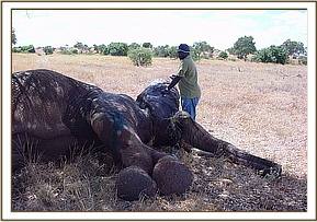 The first case in Tsavo East was at Aruba area and was of an elephant bull with a bullet wound at the right carpal joint. The bullet had not exited and could still be lodged in the body. It is not practically possible under field conditions to operate and remove it. The wound was deep (≥ ½ foot) and heavily infected. The puss was cleaned out as much as was possible with water and hydrogen peroxide after which it was infused with a topical antibiotic. A high dose of a systemic antibiotic was also administered. The prognosis is guarded and depends on whether the bone is affected or not, something we could not establish in this particular case.