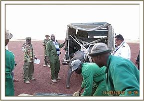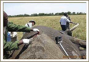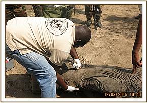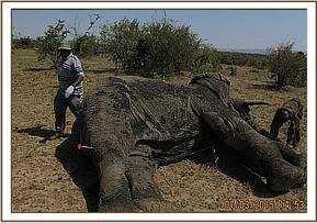 This elephant was immobilized by use of 16mgs Etorphine Hydrochloride delivered through a 3ml Dan-inject dart from a vehicle. The drugs fully discharged but the elephant would not go down. He showed partial narcotization and after 25minutes of waiting, a top up dart with 5ml Etorphine was prepared and the elephant was darted a second time. The drugs took effect after four minutes with the elephant assuming right lateral recumbency position. This became a disvantage because the wound was on the right side and became hard to access. Meanwhile; the collaring team was advised to continue fitting the GSM/Satellite collar before the elephant was turned over to clean the wound. The elephant was flipped over by use of ropes and a vehicle.