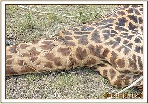This giraffe was alone in a sparsely wooded area with no other giraffes seen nearby and he appeared in great pain. The spear was deeply embedded with ruminal contents seeping from the entry.